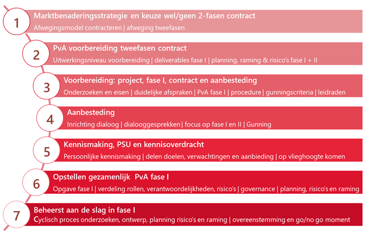 Een complex bouwproject uitwerken via een tweefasen-contract kan dus grote voordelen opleveren voor de uitvoeringsfase. Daar staat tegenover dat deze contractvorm zijn eigen complexiteit met zich meebrengt. Bijvoorbeeld als het gaat over de precieze verdeling van verantwoordlijkheden. Ook zien opdrachtgevers de uitgestelde prijsvorming vaak als risicovol. Daarom hebben wij een gestructureerde aanpak ontwikkeld in zeven stappen. Daarmee helpen wij onze opdrachtgevers de juiste afweging te maken: eerst bepalen we gezamenlijk of een tweefasen-contract wel of geen goede optie is. Als de keuze hierop valt, werken we samen beheerst en voorspelbaar toe naar de voorbereiding en uitvoering van fase één.